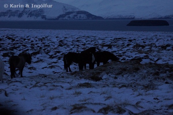 Yesterday we took a drive to Dalvík to meet our friends Gabi and Jutta, who joined a group of riders from Saltvík for the horseroundup in Svafardalur. Not so many horses, but if I translate their happy faces right, they had a great time with good horses. And they were lucky with the weather, too. A bit of snow, a bit cold, but not too bad. It was so nice to meet them and chat a bit since we don't meet so often. Hope they'll finally come to stay a bit with us.