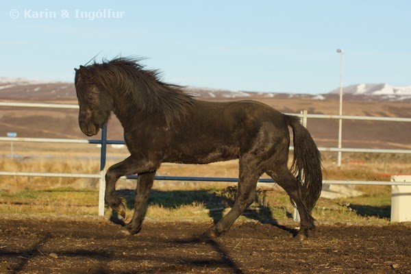 Nökkvi showed mostly trott but seems to be bombproof already at his young age. He's interested in everything and very playful, but not scared with new things. If he goes on like that, he'll be a lifeensurance in the future.
