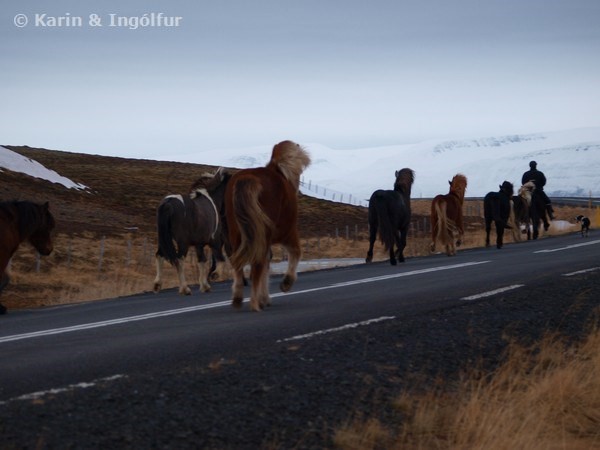 In the afternoon we packed our things together and put the horses in the trailer to go for a visit in Helluland. Kiddi had made a track on the ice on one of his meadows which is regularly flooded in wintertime. The ice is about 50cm thick and with the meadow underneath, there is no danger of taking an undesired bath.