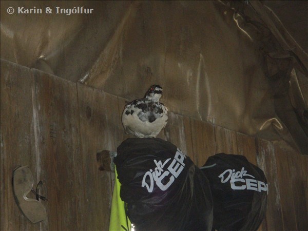 This time the visitor was a bit bigger... When I took Dalur out of his box I heard the noise of quite big wings and had a look, which bird came to visit now. It was a Ptarmigan! I was so lucky to have a camera at the stable and took this pic of it sitting on Bjössi's helmet.